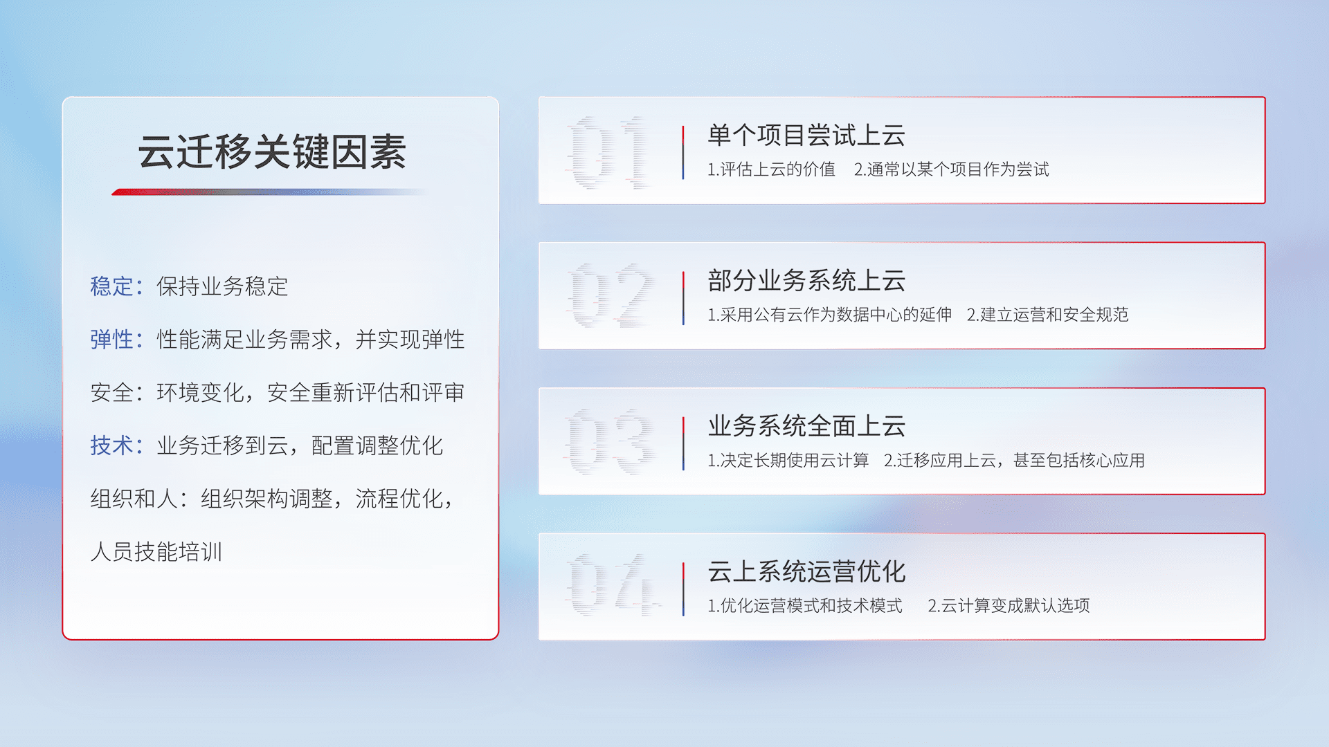 结合实际业务,,从规划设计、、云平台选型、、、云原生改造、、、、数据迁移、、、、集成交付,,,迁移全过程为客户识别最佳上云路径,,,,做好风险识别管理,,设计网络架构、、身份权限、、、安全审计合规、、操作审计、、、日志审计、、监控告警策略、、、多站点容灾设计等,,,,对云上基础设施进行整体规划,,提升IT治理水平,,,,以满足弹性、、高可用、、、高性能的需求。。。。