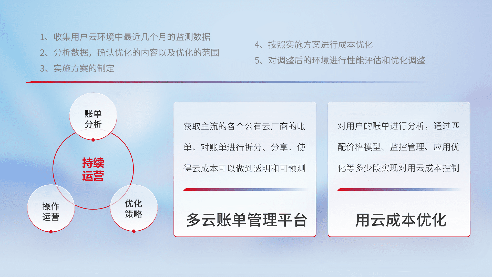 通过多云纳管,,以统一的资源数据模型把客户的云资源进行抽象和封装,,进而实现对多云资源的统一操作,,,保障云资源管理的可靠性、、、、稳定性与可用性。。量身定制化运维内容,,,配置、、、、开发运维、、、补丁管理、、、备份、、监控、、认证和访问管理、、、、审计和日常巡检等,,,,保障在用云过程中的可靠度,,,,稳定度以及高可用率。。