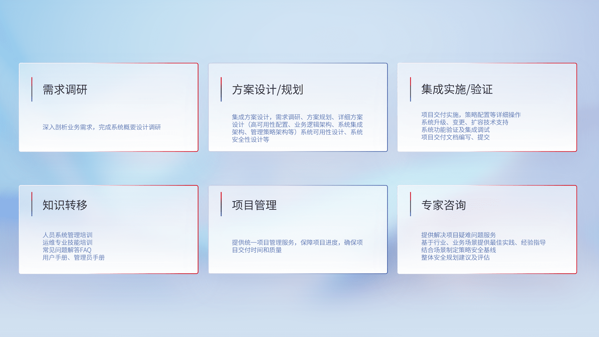 针对客户行业特性,,,将宏观的安全战略和需求,,,通过专业的交付服务,,实现项目落地,,,,为客户提供标准规范的集成交付服务。。。。